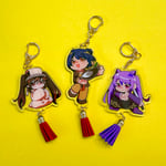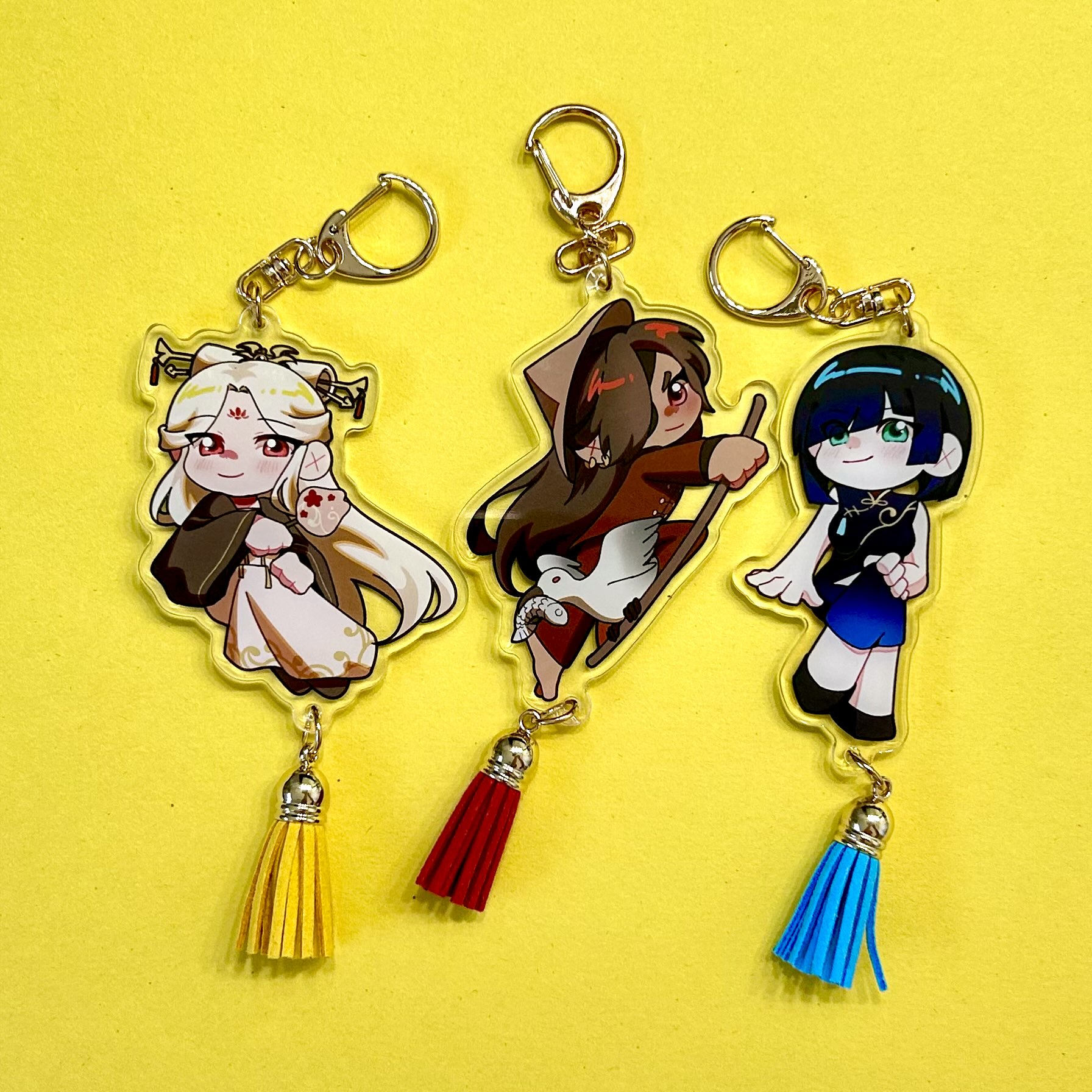 2.5 & 3 in. acrylic charms with colored tassels. Inspired by Chinese fashion both traditional and modern. Features Beidou, Ningguang, Xiao, Yelan, Keqing, Ganyu, Hu Tao, Xiangling, Xinyan, and Yun Jin from Genshin Impact.