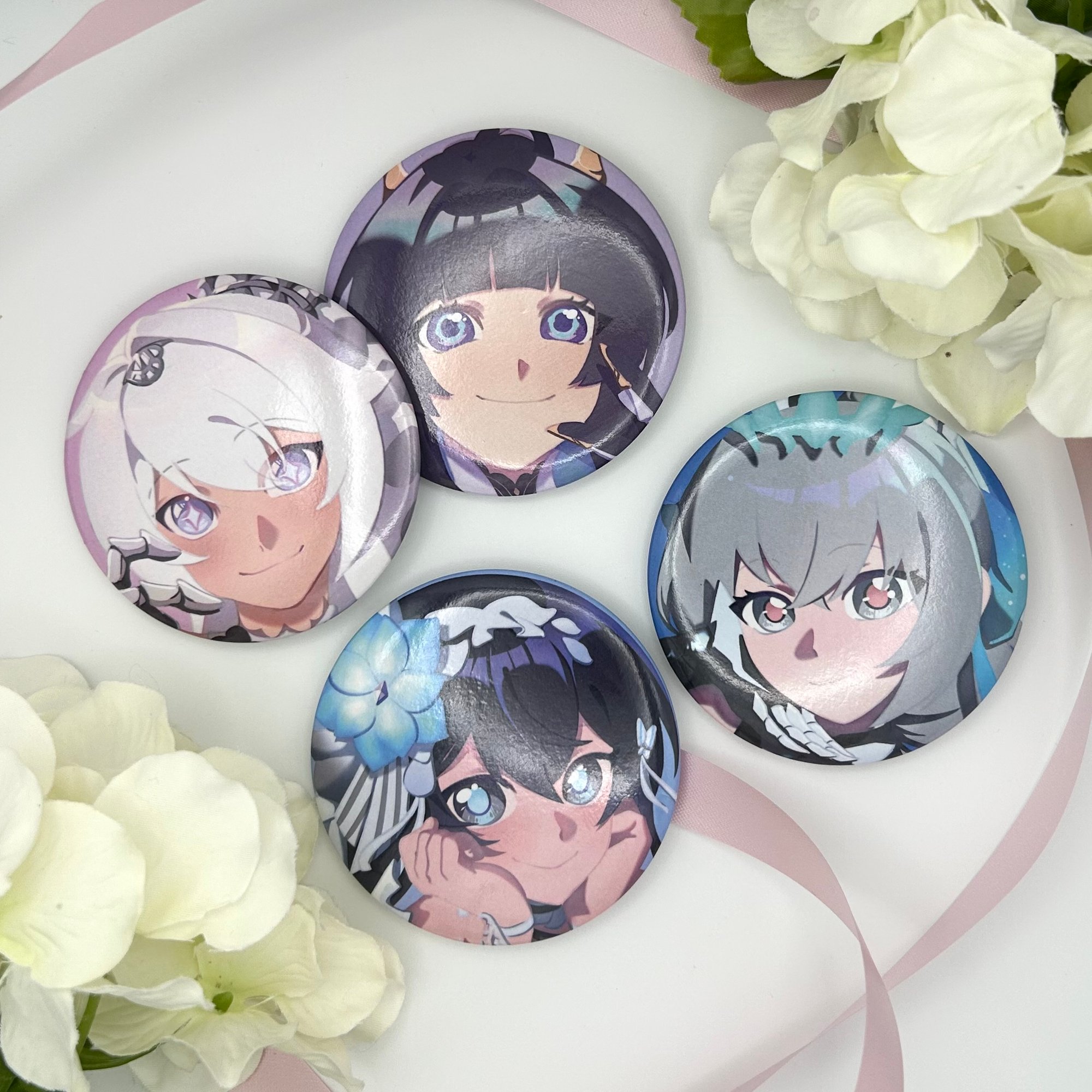 78 mm tin can badges of Kiana Kaslana, Raiden Mei, Bronya Zaychik, and Seele Vollerei.