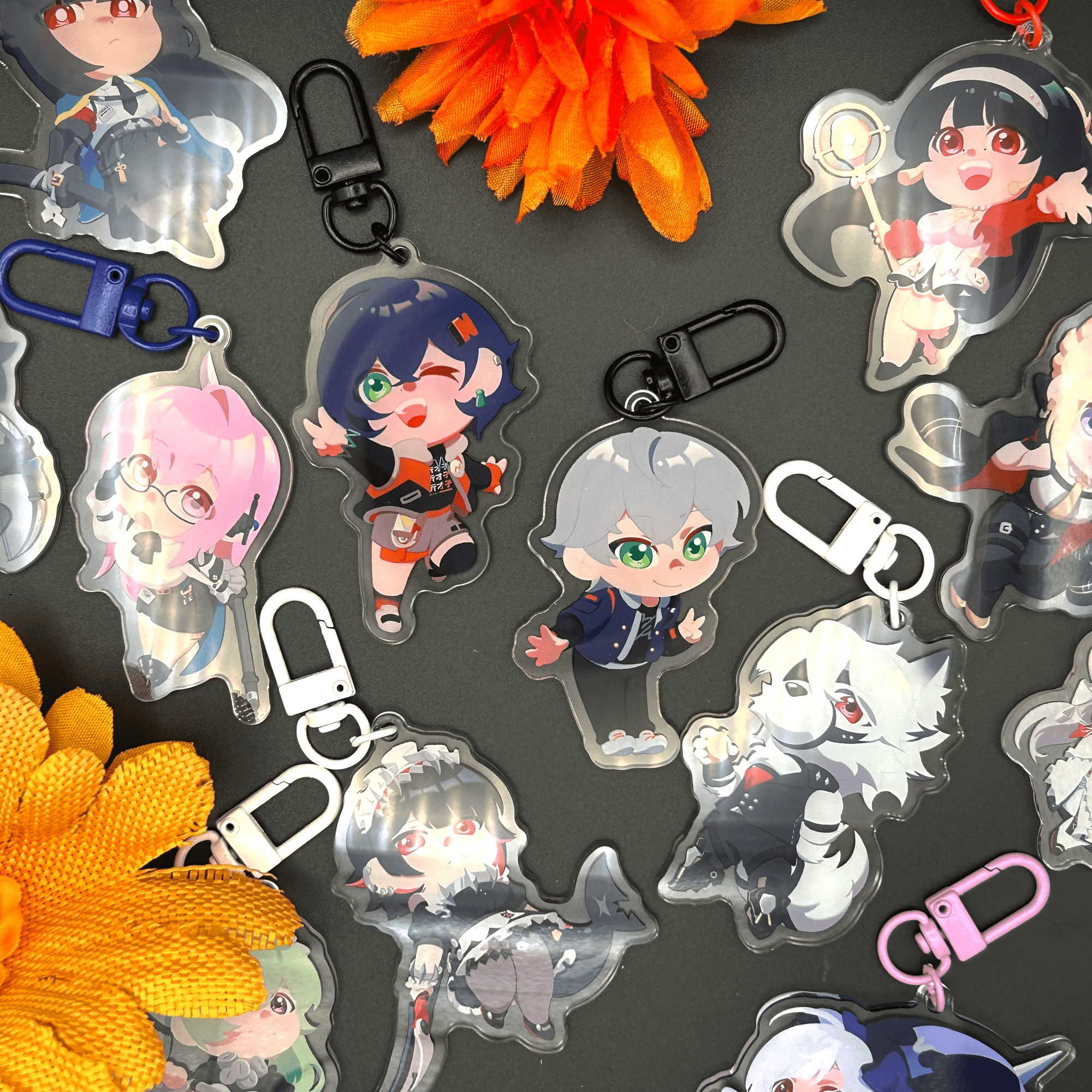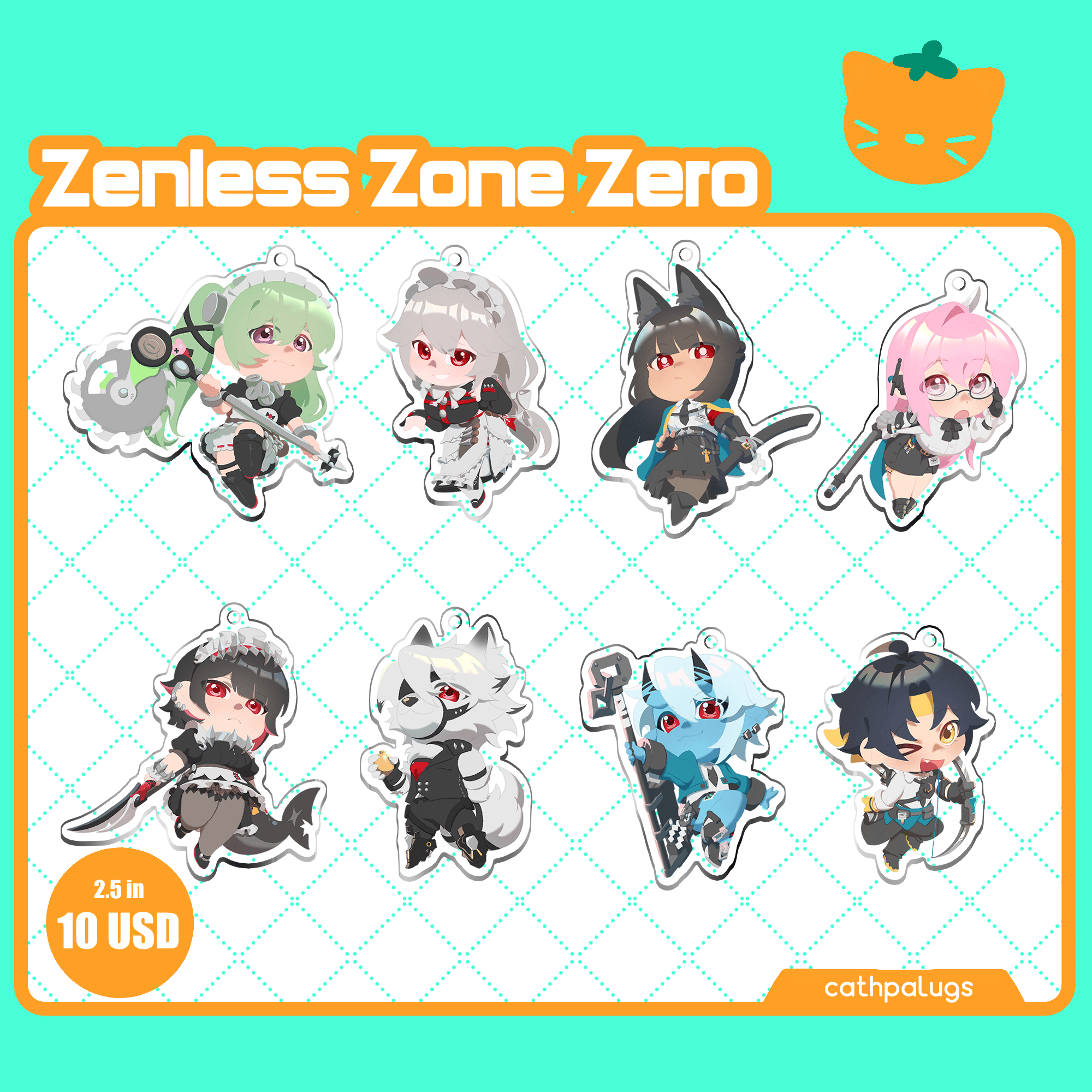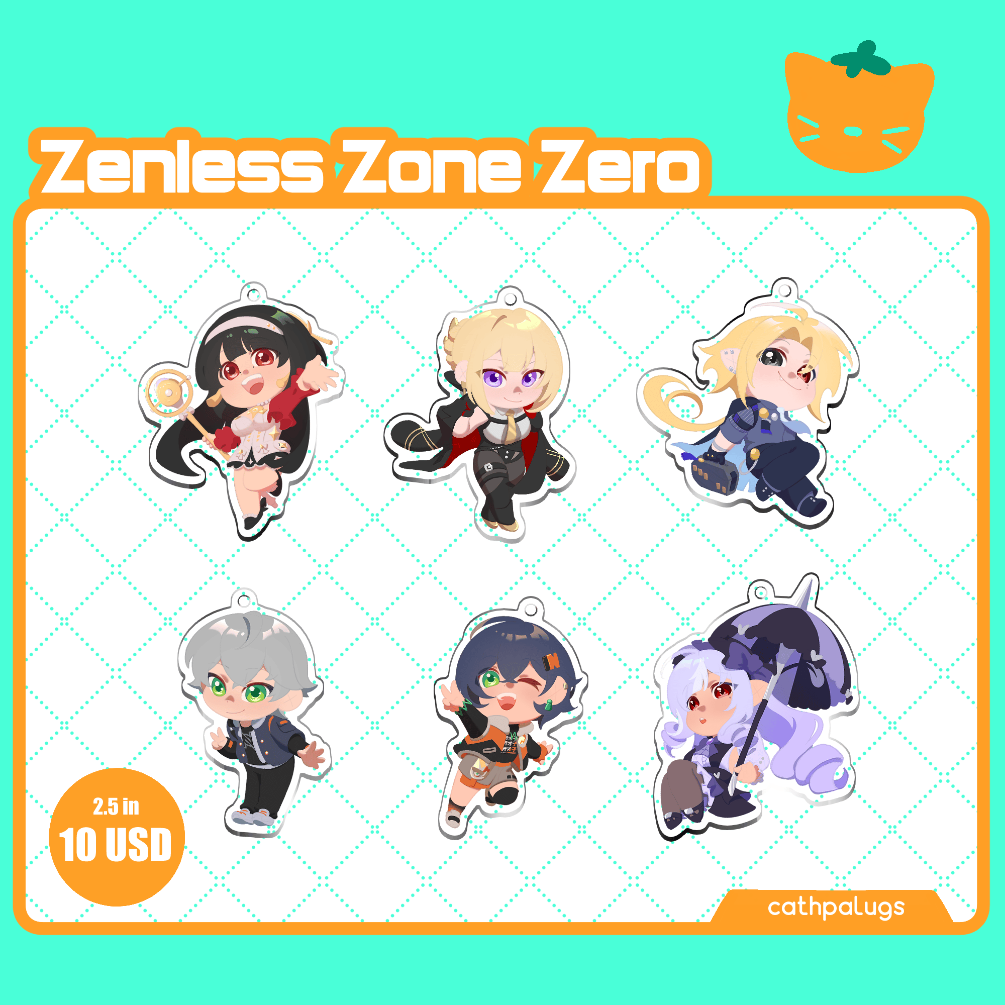 2.5 inch tall acrylic charms of Section 6, Phaethon, Victoria's Housekeeping, Mockingbird, and Stars of Lyra from Zenless Zone Zero.